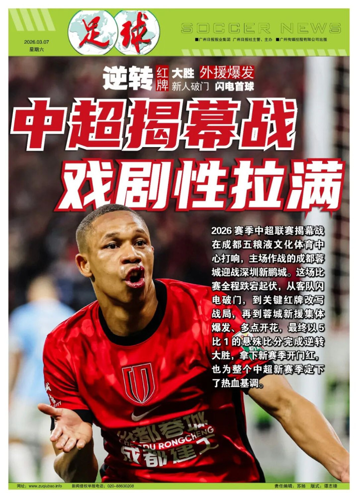 记者鲁蜜报道 2026赛季中超联赛揭幕战在成都五粮液文化体育中心打响,主场作战的成都蓉城迎战深圳新鹏城。这场比赛全程跌宕起伏,从客队闪电破门,到关键红牌改写战局,再到蓉城新援集体爆发、多点开花,最终蓉城以5比1的悬殊比分完成逆转大胜,拿下新赛季开门红,也为整个中超新赛季定下了热血基调。