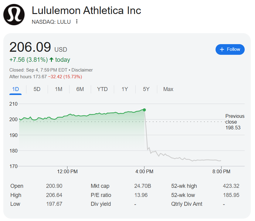 9月4日,Lululemon公布业绩报告,每股收益3.10美元超出2.87美元的预期,但这个"惊喜"很快被收入端的疲软所掩盖。