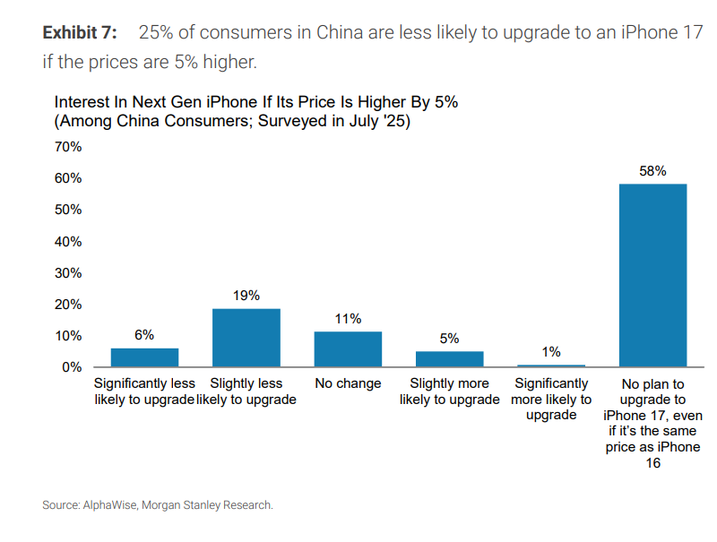 不过,价格敏感性依然是一个需要警惕的风险。一份于2025年7月在中国进行的调查显示,如果iPhone 17价格上涨5%,25%的中国消费者表示他们升级的可能性会降低。综合来看,分析师认为当前的出货量预期设定合理,但未来的风险更偏向于上行而非下行。