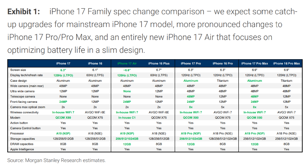 报告认为,此次发布会预计不会出现重大意外。iPhone 17系列将包括常规的iPhone 17、iPhone 17 Pro/Pro Max,以及全新超薄机型iPhone 17 Air,其采用单后置摄像头和苹果自研C1调制解调器。