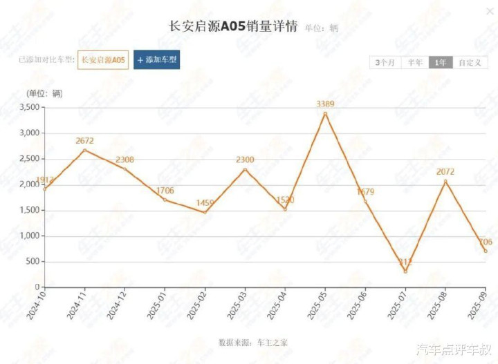 数据显示,最近12个月中,长安启源A05销量在2025年5月达到最高,销量为3389辆,到了9月份仅售出706辆,连热门新能源车型的零头都不到,相比今年8月份2072辆的销量,环比暴跌65.93%,并且相比2024年9月份2719辆的销量,同比下滑74.03%,而2025年1-9月累计销量也只有15143辆,同比下降60.56%,成为长安启源系列中销量最低的车型之一。