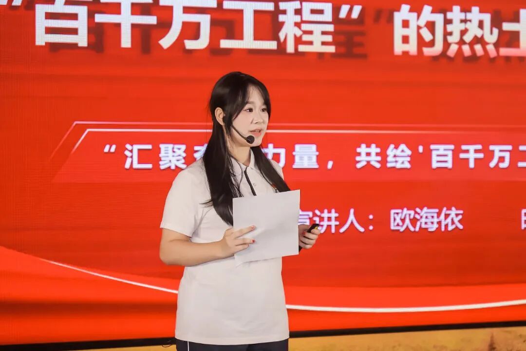 随后,广州松田学院学生欧海依以《青春的答卷:在“百千万工程”的热土上书写我们的故事》为题,分享了广州华商职业学院学子蔡俊杰的返乡创业事迹。这位青年扎根乡土创办民宿,不仅打通了农产品产销链路,更带动村民实现家门口就业增收。